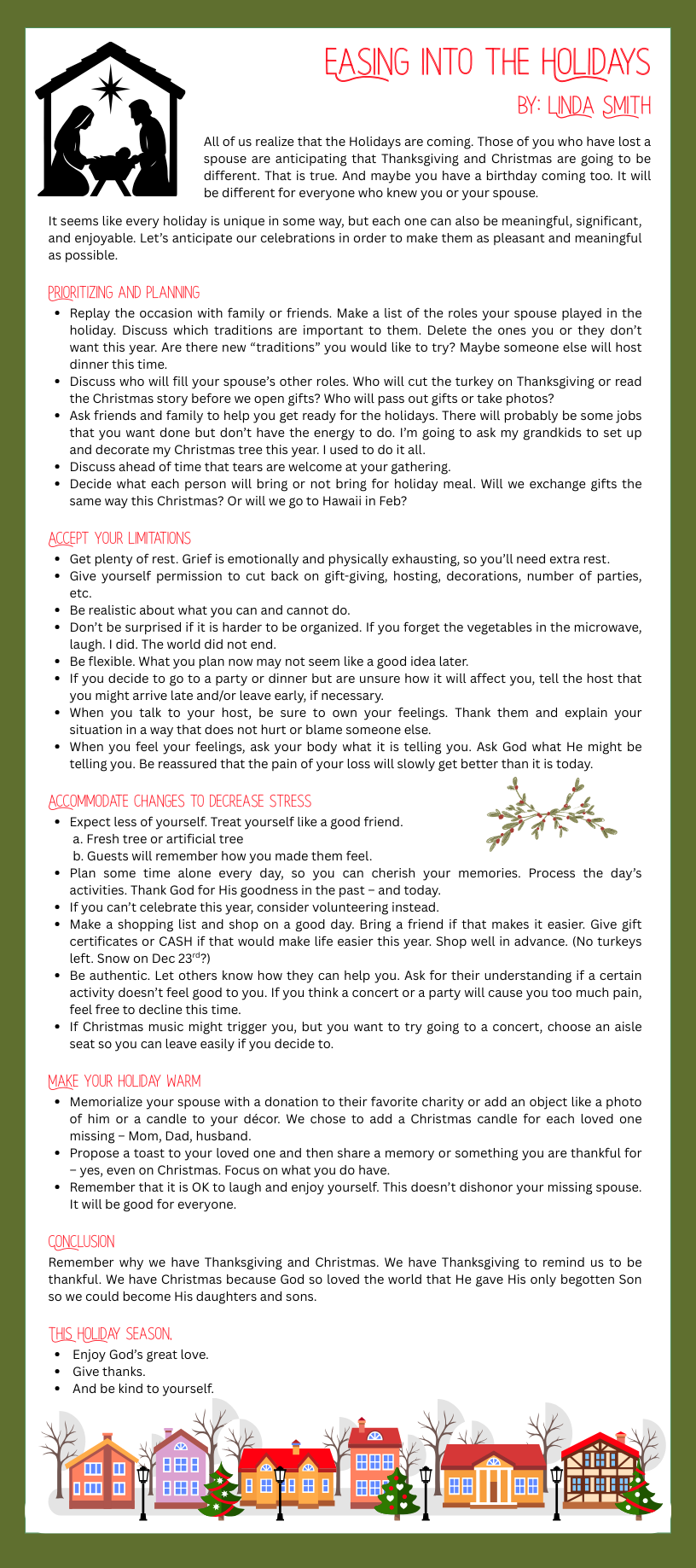“I am grateful for being invited to the Thursday evening Zoom Widows' meeting led by Linda Smith and Mary Beth Woll. God's hand was evident in the timing as my husband of 53 years passed away, suddenly and unexpectedly, on the Fourth of July 2020. Mary Beth spotted messages of condolence on social media and promptly reached out, introduced me to Linda and they embraced my broken heart.”